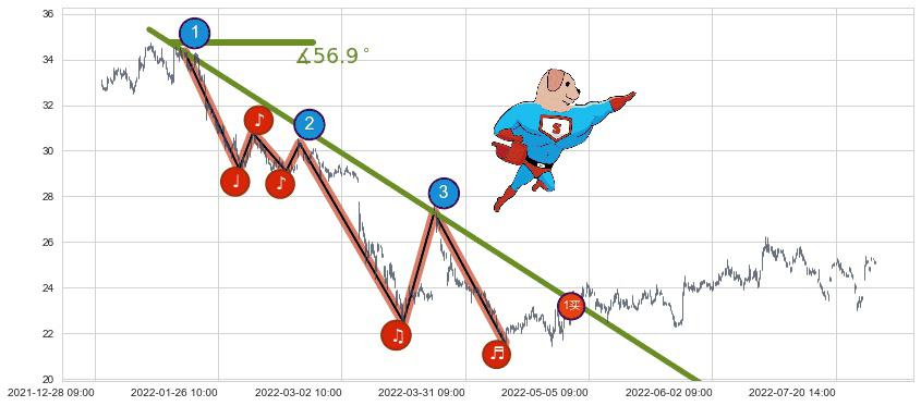 从2022-01-10 14:00至2022-05-31 13:00,共包含450个小时,阶段股价下跌-32.60%,阶段股价变动位移路程比: 1 : 9,下跌趋势角度: 56.9