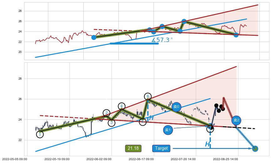 ➢ 最小反转跌幅→𝐇: 2.195 (逐步抬高阻力斜边最后的阻力点⑥与支撑边垂直距离)