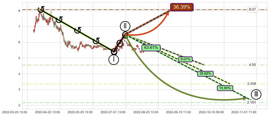 ♘ 在最后的下跌阶段2022-04-06 13:00至2022-08-12 13:00,存在 持续未破位的阻力位 ,阻力价格6.12,可信任强度85.16%,其距离最后价格5.49相差 +11.55%