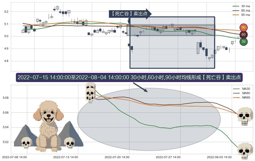 ⚀ 2022-07-18 13:00:00-小时至2022-08-04 14:00:00-小时显现 30小时-60小时-90小时均线 【死亡谷】卖出点 看空信号,后市看跌,卖出