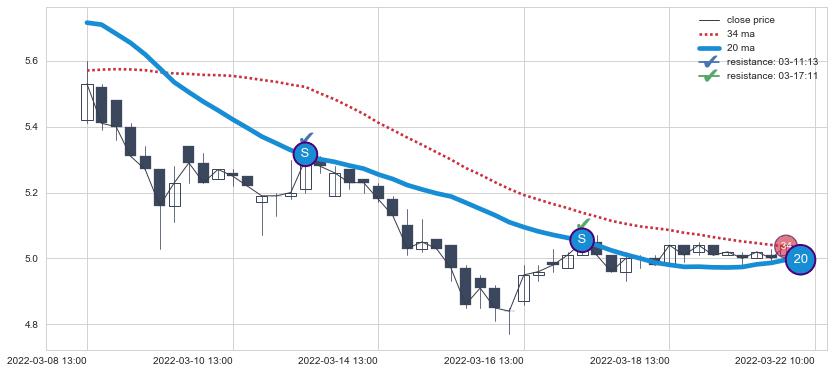⚂ 第⑦卖出点 刚刚再次反弹均线向下回落, 阻力 效果并未十分稳固,属于【激进】的卖出信号,高时效看空信号