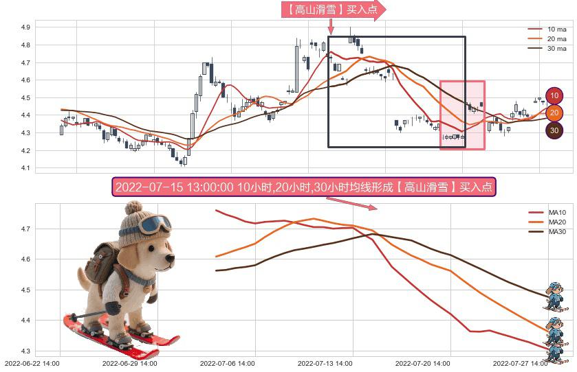 ⚀ 2022-07-04 14:00:00小时-2022-07-27 14:00:00小时显现 10小时-20小时-30小时均线 【高山滑雪】买入点 看多信号,后市看涨,买入
