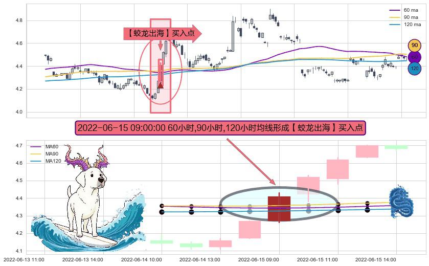 ⚀ 2022-06-15 09:00:00小时显现 60小时-90小时-120小时均线 【蛟龙出海】买入点 看多信号,后市看涨,买入
