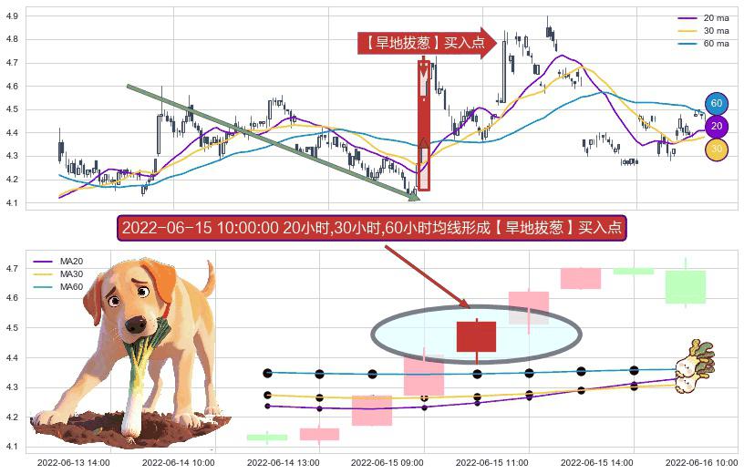 ⚀ 2022-06-15 10:00:00小时显现 20小时-30小时-60小时均线 【旱地拔葱】买入点 看多信号,后市看涨,买入