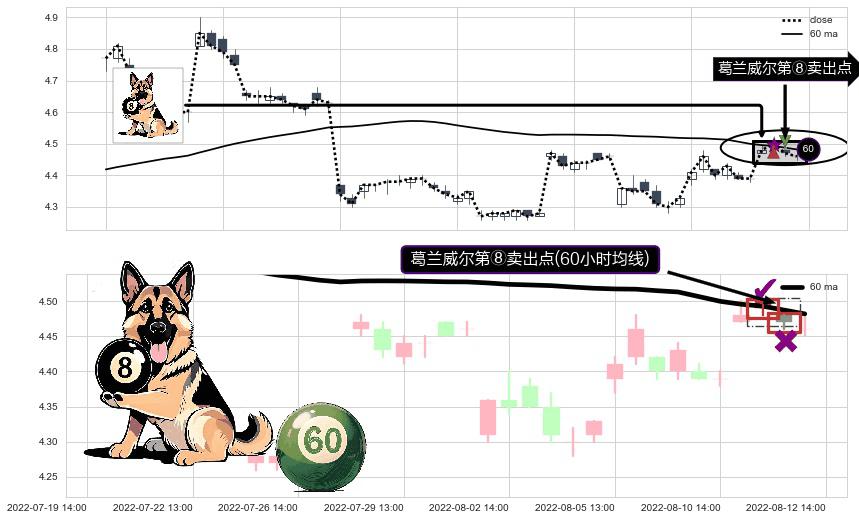 ⚀ 2022-08-12 13:00:00-小时显现 葛兰威尔均线 60小时均线 第⑧卖出点 下降趋势的中继信号,后市看跌,卖出信号