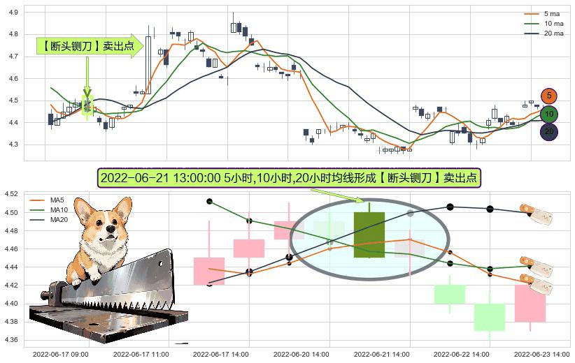 ⚀ 2022-06-21 13:00:00小时显现 5小时-10小时-20小时均线 【断头铡刀】卖出点 看空信号,后市看跌,卖出