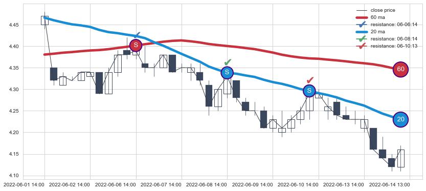 ⚃ 第⑧卖出点 刚刚再次破位下穿均线, 阻力 效果并未十分稳固,属于【激进】的卖出信号,高时效看空信号