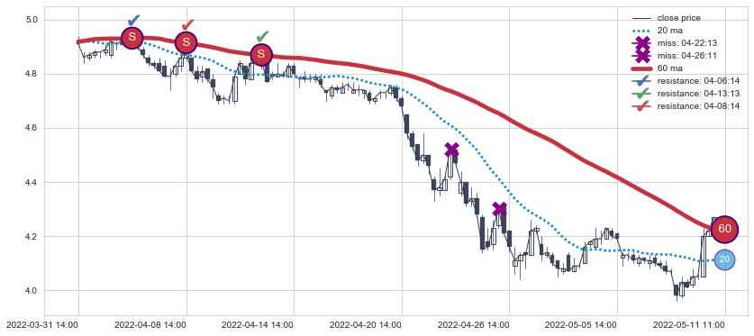 ⚄ 均线向上突破后价格围绕均线附近波动,并未远离均线,再次向下破位后维持原均线下跌趋势【极强】