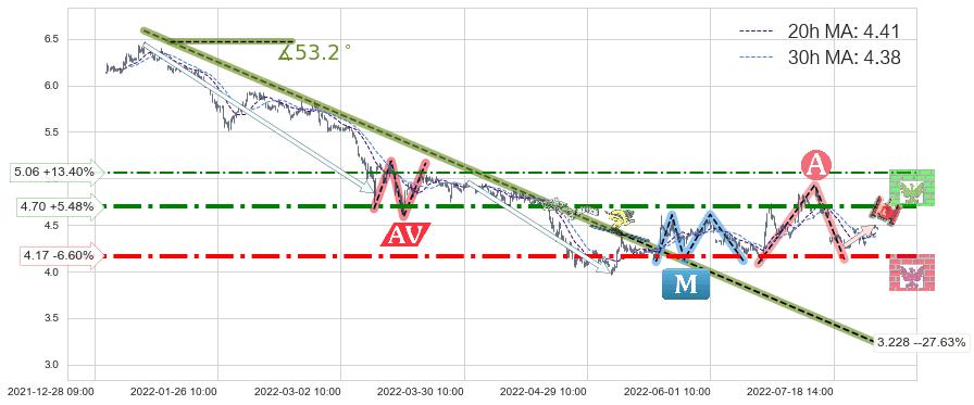 ♘ 阻力价格位4.70,可信任强度78.85%,距离最后交易2022-08-12 14:00形成的收盘价格4.46相差 +5.48%