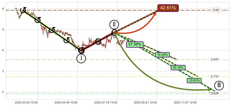 ➣ 大趋势循环浪继续向下概率57.39%