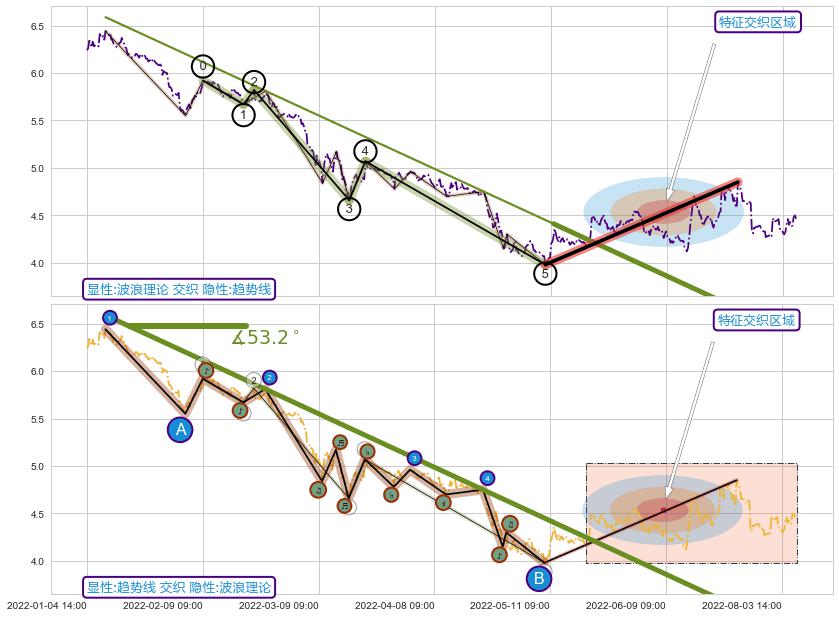 从2022-06-09 13:00至2022-07-25 13:00,共包含83个小时,阶段股价上涨2.38%,阶段股价变动位移路程比: 1 : 33