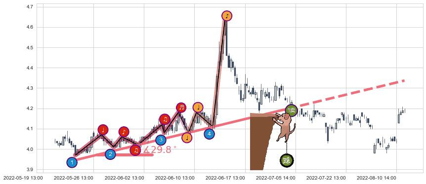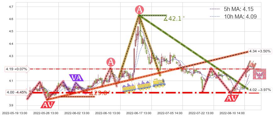 ✂️ 2022-05-24 14:00-2022-07-01 14:00上升趋势存在反转[风险],其原上升趋势的支撑位(4.34)已破位[强阻力信号],原上升趋势角度: 29.8˚