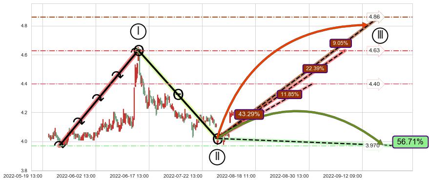 ➢ 循环浪继续向上【最低】位置(08-31:10, 4.40),匹配聚类样本比例27.38%, 可能性概率11.85%