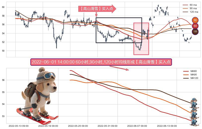 ⚀ 2022-05-20 13:00:00小时-2022-06-15 09:00:00小时显现 60小时-90小时-120小时均线 【高山滑雪】买入点 看多信号,后市看涨,买入
