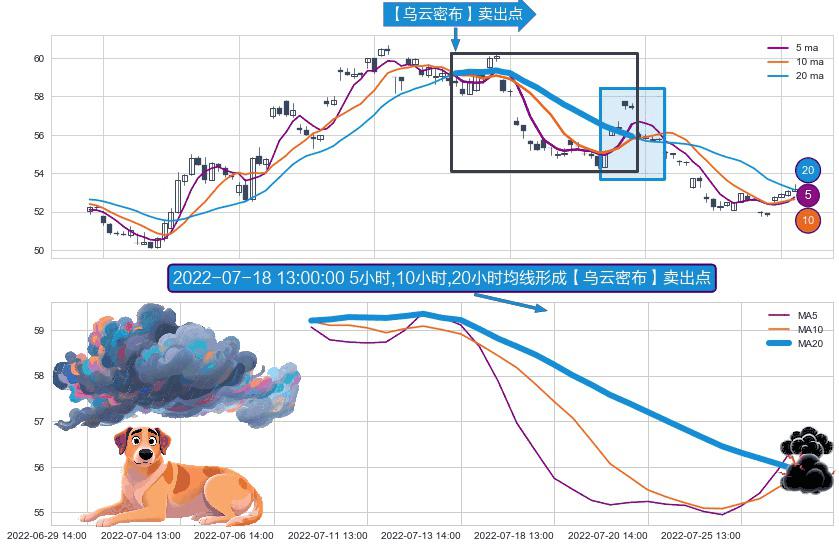⚀ 2022-07-07 14:00:00小时-2022-07-26 14:00:00小时显现 5小时-10小时-20小时均线 【乌云密布】卖出点 看空信号,后市看跌,卖出