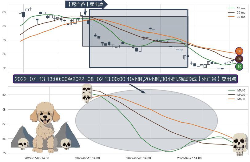 ⚀ 2022-07-13 14:00:00-小时至2022-08-02 13:00:00-小时显现 10小时-20小时-30小时均线 【死亡谷】卖出点 看空信号,后市看跌,卖出