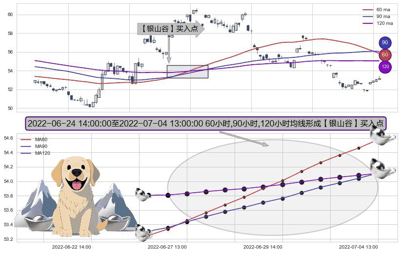 ⚀ 2022-06-27 13:00:00-小时至2022-07-04 13:00:00-小时显现 60小时-90小时-120小时均线 【银山谷】买入点 看多信号,后市看涨,买入