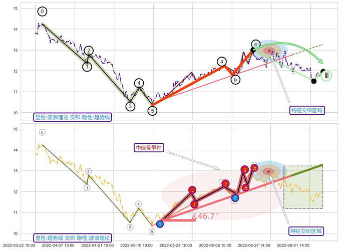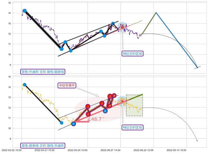 ➢ 2022-05-12 13:00-2022-07-15 13:00上升趋势存在反转[风险],其原上升趋势的支撑位(13.27)已破位[强阻力信号],原上升趋势角度: 46.7˚