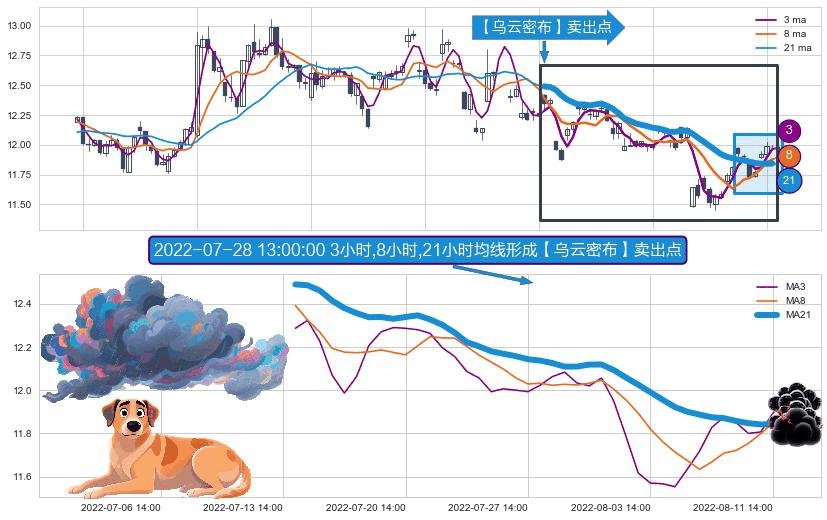 ⚀ 2022-07-14 13:00:00小时-2022-08-12 13:00:00小时显现 3小时-8小时-21小时均线 【乌云密布】卖出点 看空信号,后市看跌,卖出