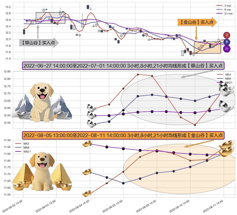 ⚄ 2022-08-05 14:00:00-小时至2022-08-11 14:00:00-小时显现 3小时-8小时-21小时均线 【金山谷】买入点 其再次确认了买入信号,可靠性更强,买入