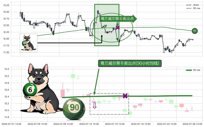 ⚀ 2022-07-12 13:00:00-小时显现 葛兰威尔均线 90小时均线 第⑥卖出点 走势反转见顶信号,后市看跌,卖出信号