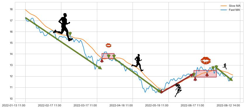 01-13 11:00至03-22 10:00 慢线与快线呈空头排列, 慢线与快线接触少,无缠绕