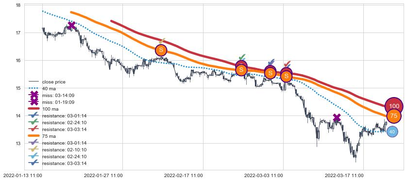 ⚅ 卖点向下突破均线后,价格走势有持续向下的迹象,但动能稍显不足,迟迟不能远离均线