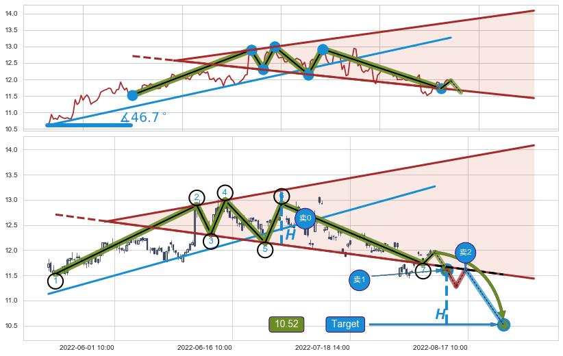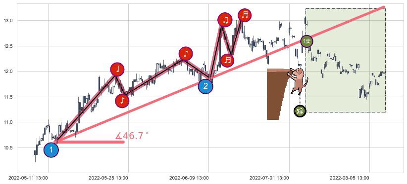 从2022-05-12 13:00至2022-07-15 13:00,共包含166个小时,阶段股价上涨13.24%,阶段股价变动位移路程比: 1 : 10,上涨趋势角度: 46.7