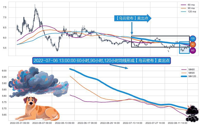 ⚀ 2022-06-10 10:00:00小时-2022-08-12 14:00:00小时显现 60小时-90小时-120小时均线 【乌云密布】卖出点 看空信号,后市看跌,卖出