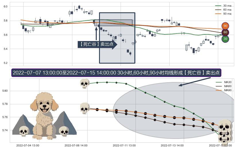 ⚀ 2022-07-07 14:00:00-小时至2022-07-15 14:00:00-小时显现 30小时-60小时-90小时均线 【死亡谷】卖出点 看空信号,后市看跌,卖出