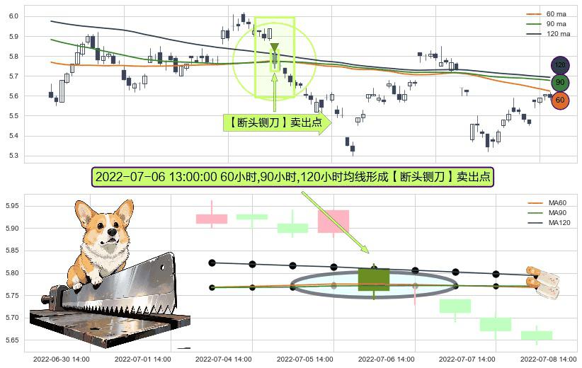 ⚀ 2022-07-06 13:00:00小时显现 60小时-90小时-120小时均线 【断头铡刀】卖出点 看空信号,后市看跌,卖出
