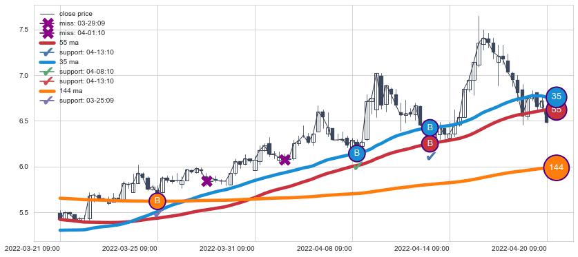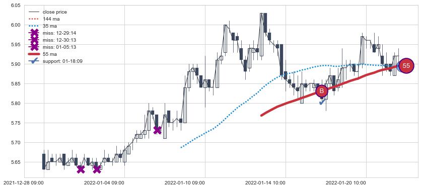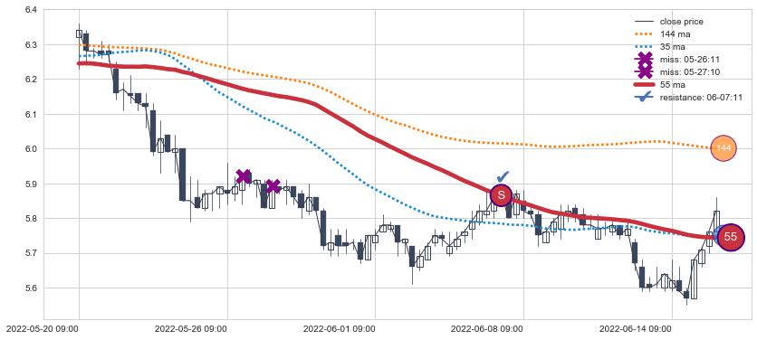 ⚂ 2022-06-30 13:00:00-小时均线向上突破,2022-07-04 13:00:00-小时重新下穿均线破位,均线阻力再次生效