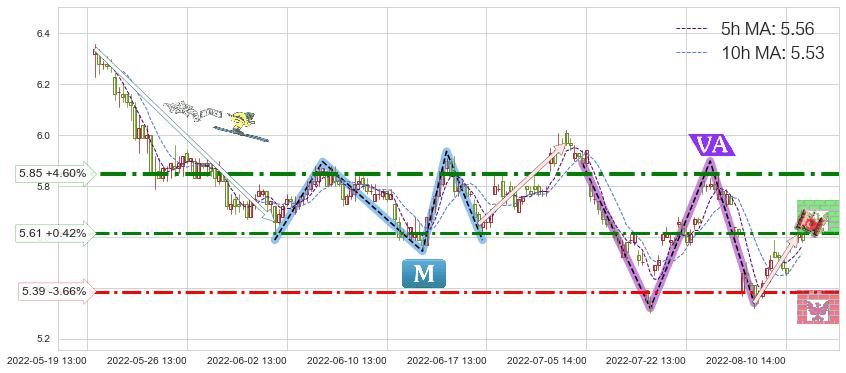 ♘ 阻力价格位5.85,可信任强度76.98%,距离最后交易2022-08-12 14:00形成的收盘价格5.59相差 +4.60%