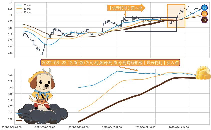 ⚀ 2022-06-09 14:00:00小时-2022-07-19 13:00:00小时显现 30小时-60小时-90小时均线 【烘云托月】买入点 看多信号,后市看涨,买入