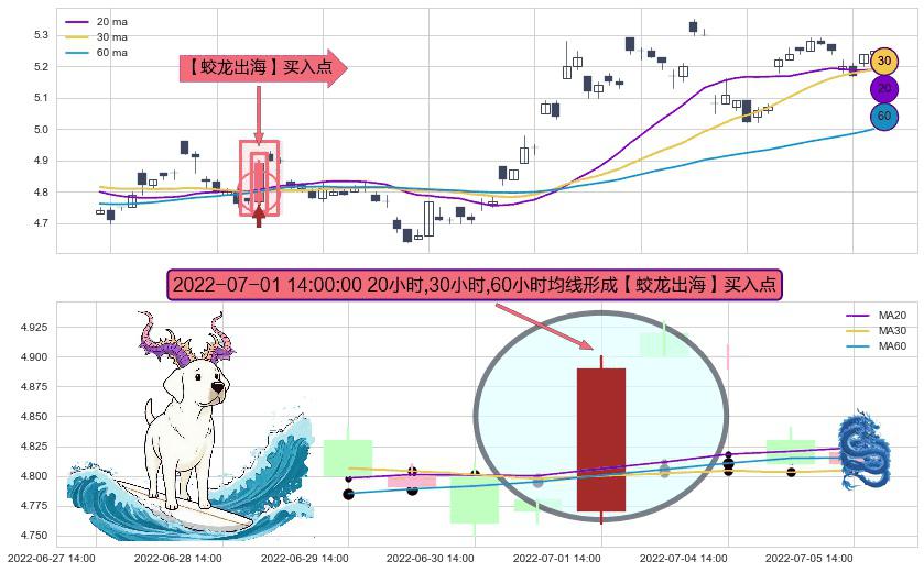 ⚀ 2022-07-01 14:00:00小时显现 20小时-30小时-60小时均线 【蛟龙出海】买入点 看多信号,后市看涨,买入