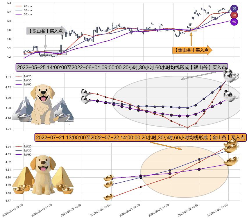 ⚂ 金山谷 高于 银山谷,表明 均线逆转 反弹势头明确,是更强的见底信号更可靠的买入信号