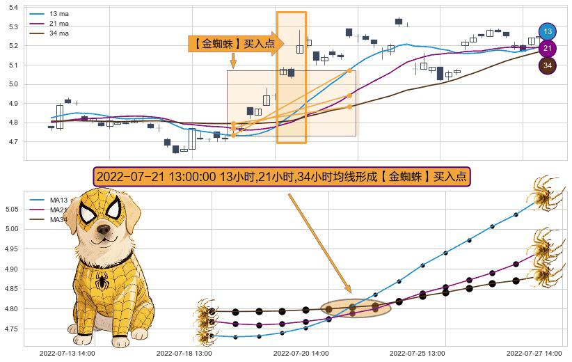 ⚀ 2022-07-21 13:00:00小时显现 13小时-21小时-34小时均线 【金蜘蛛】买入点 看多信号,后市看涨,买入