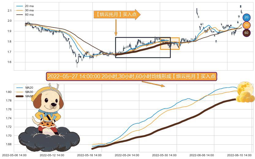 ⚀ 2022-05-17 14:00:00小时-2022-06-09 14:00:00小时显现 20小时-30小时-60小时均线 【烘云托月】买入点 看多信号,后市看涨,买入