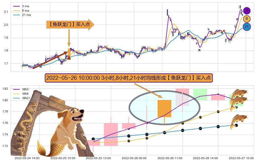 ⚀ 2022-05-26 10:00:00小时显现 3小时-8小时-21小时均线 【鱼跃龙门】买入点 看多信号,后市看涨,买入