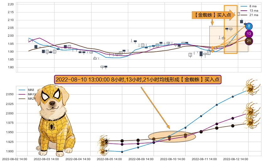 ⚀ 2022-08-10 13:00:00小时显现 8小时-13小时-21小时均线 【金蜘蛛】买入点 看多信号,后市看涨,买入
