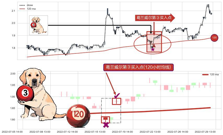 ⚀ 2022-07-18 13:00:00-小时显现 葛兰威尔均线 120小时均线 第③买入点 上升趋势的中继信号,后市看涨,买进信号