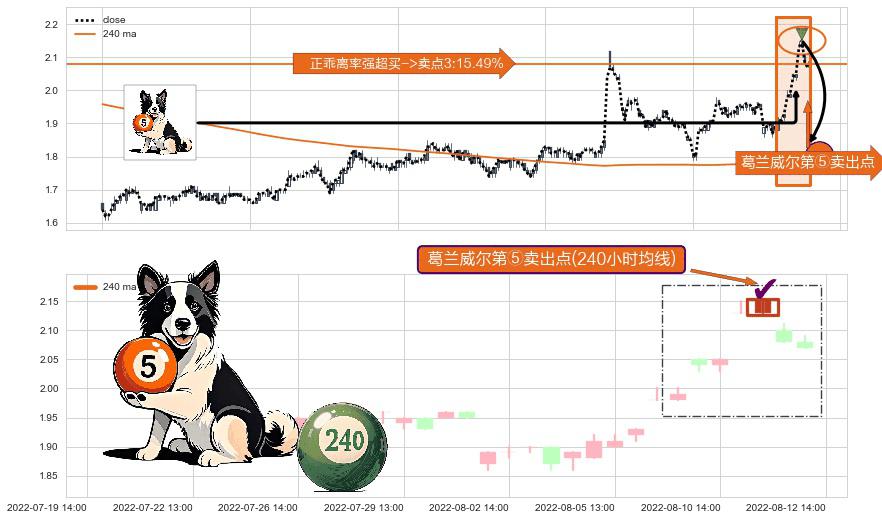 ⚀ 2022-08-11 14:00:00-小时显现 葛兰威尔均线 240小时均线 第⑤卖出点 上升趋势均值回复的短线回落信号,后市看跌,卖出信号