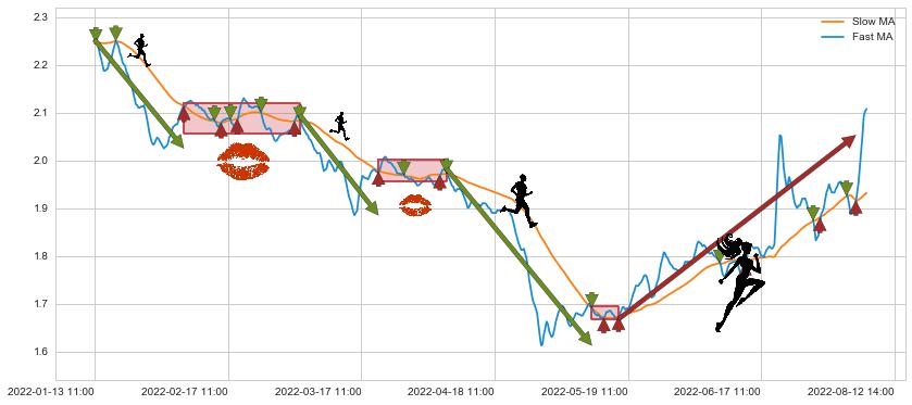 03-22 09:00至04-07 10:00 慢线与快线多次接触,存在上下穿越,有缠绕