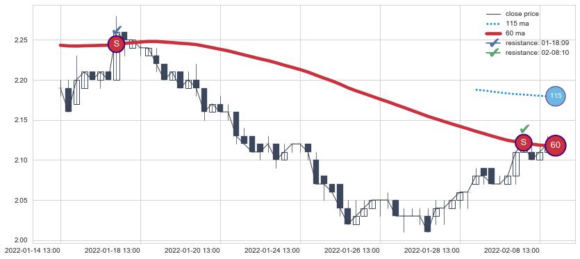 ⚂ 2022-08-05 14:00:00小时突然冒出一根大阳线,一下子顶穿三条均线且收盘价收在各条均线之上