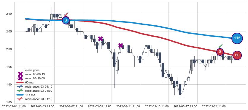 ➢ 最优均线组合共正确确认支撑阻力信号10处,正确确认率 71.43%