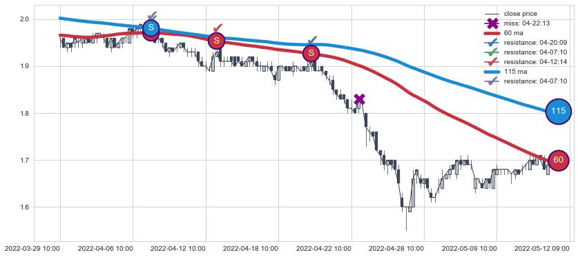 ⚃ 2022-08-11 14:00:00-小时 第⑤卖出点 距离均线【近】距离,均线主动修复向下牵引作用【强】