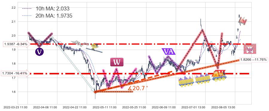 ♘ 支撑价格位1.9387,可信任强度70.13%,距离最后交易2022-08-12 14:00形成的收盘价格2.070相差 -6.34%