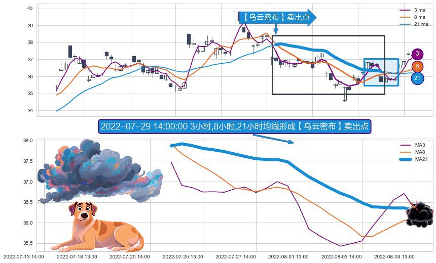 ⚀ 2022-07-21 14:00:00小时-2022-08-09 13:00:00小时显现 3小时-8小时-21小时均线 【乌云密布】卖出点 看空信号,后市看跌,卖出