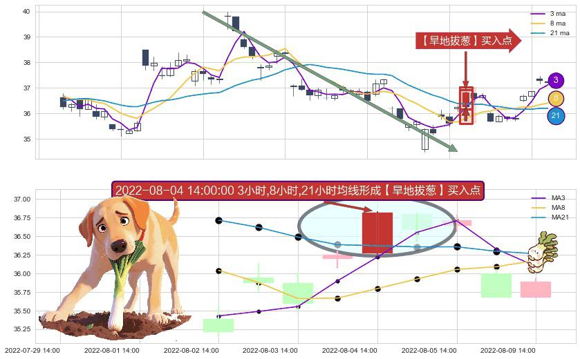 ⚀ 2022-08-04 14:00:00小时显现 3小时-8小时-21小时均线 【旱地拔葱】买入点 看多信号,后市看涨,买入