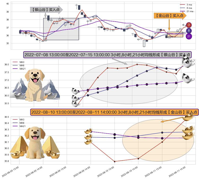 ⚄ 2022-08-10 14:00:00-小时至2022-08-11 14:00:00-小时显现 3小时-8小时-21小时均线 【金山谷】买入点 其再次确认了买入信号,可靠性更强,买入